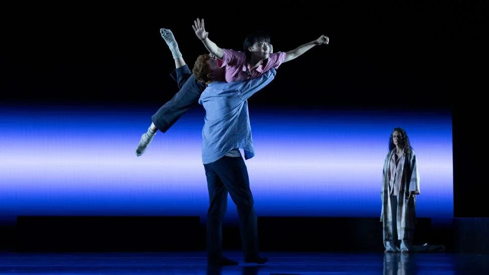 The staging is deliberately minimal. A sign reading “Sentimental writer collecting love stories” and a single typewriter draw the eye, while the screen at the back of the stage does much of the storytelling. It shifts from clouds to a starry night sky, echoing the characters’ journeys and underscoring the power of the words. Choreography by Nerida Matthaei adds another dimension, showing us the language of love in motion. At times bodies collide and intertwine in sweeping gestures that suggest passion and intimacy. At other moments, dancers peel away from one another, movements sharp and fractured, embodying separation, grief and the quiet ache of unrequited love. The physicality of these moments translates emotion into shape and space, giving the audience a visceral sense of the different textures of love.